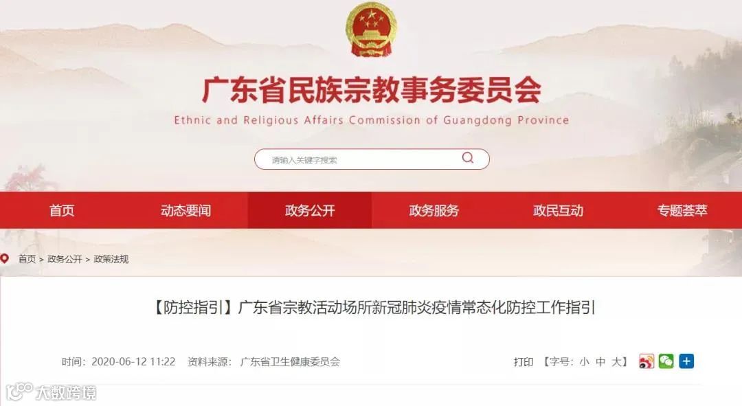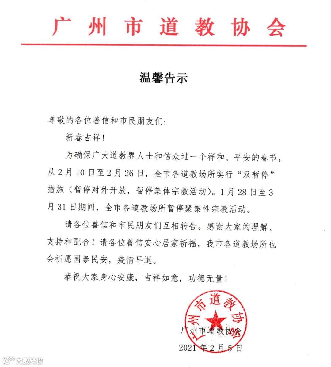 2月5日,广东省民族宗教委消息,为进一步做好疫情防控工作,保护宗教界人士和广大信教群众生命安全和身体健康,各全省性宗教团体决定,2月10日至2月26日,全省各宗教活动场所、民间信仰场所暂停对外开放、暂停集体宗教活动;