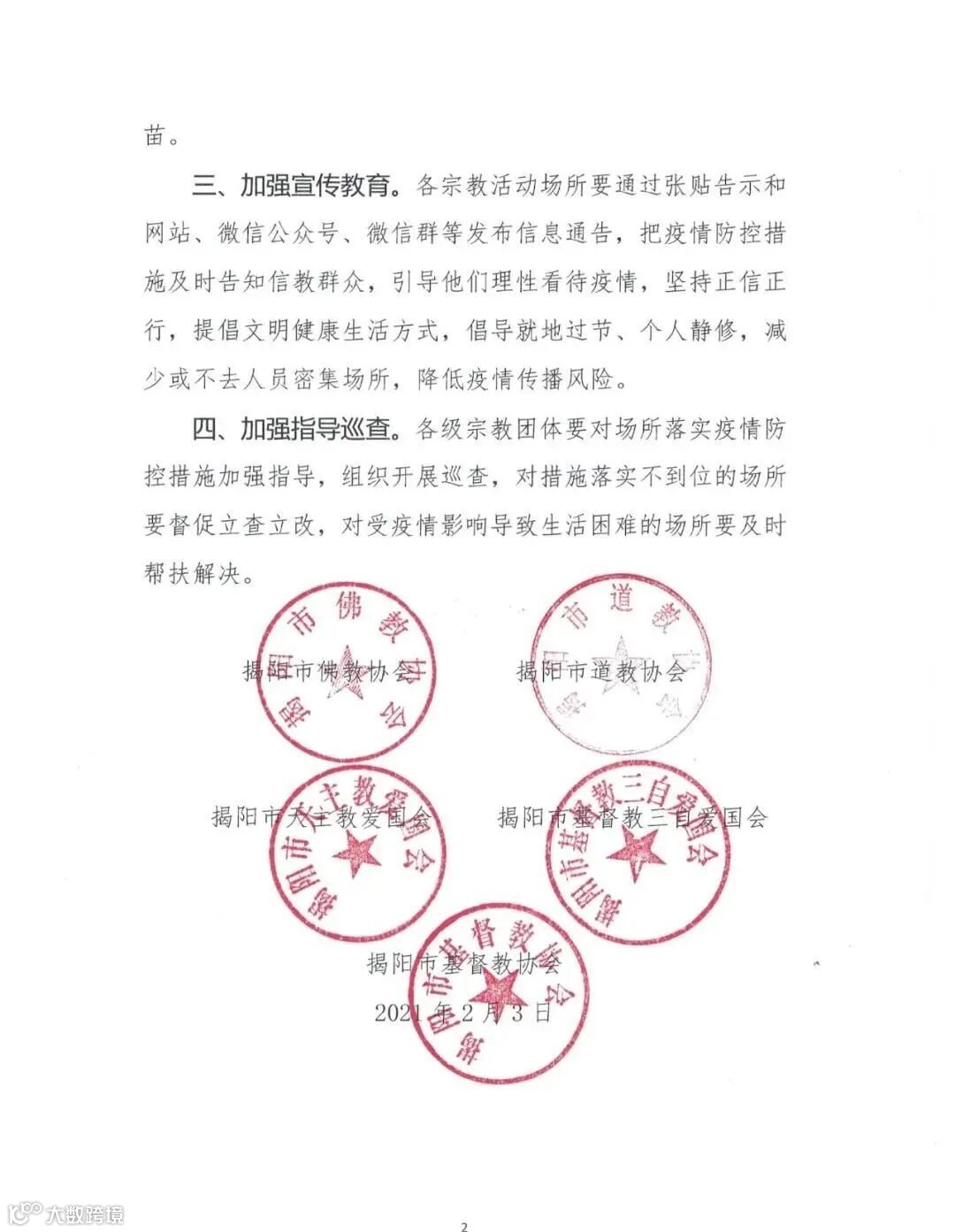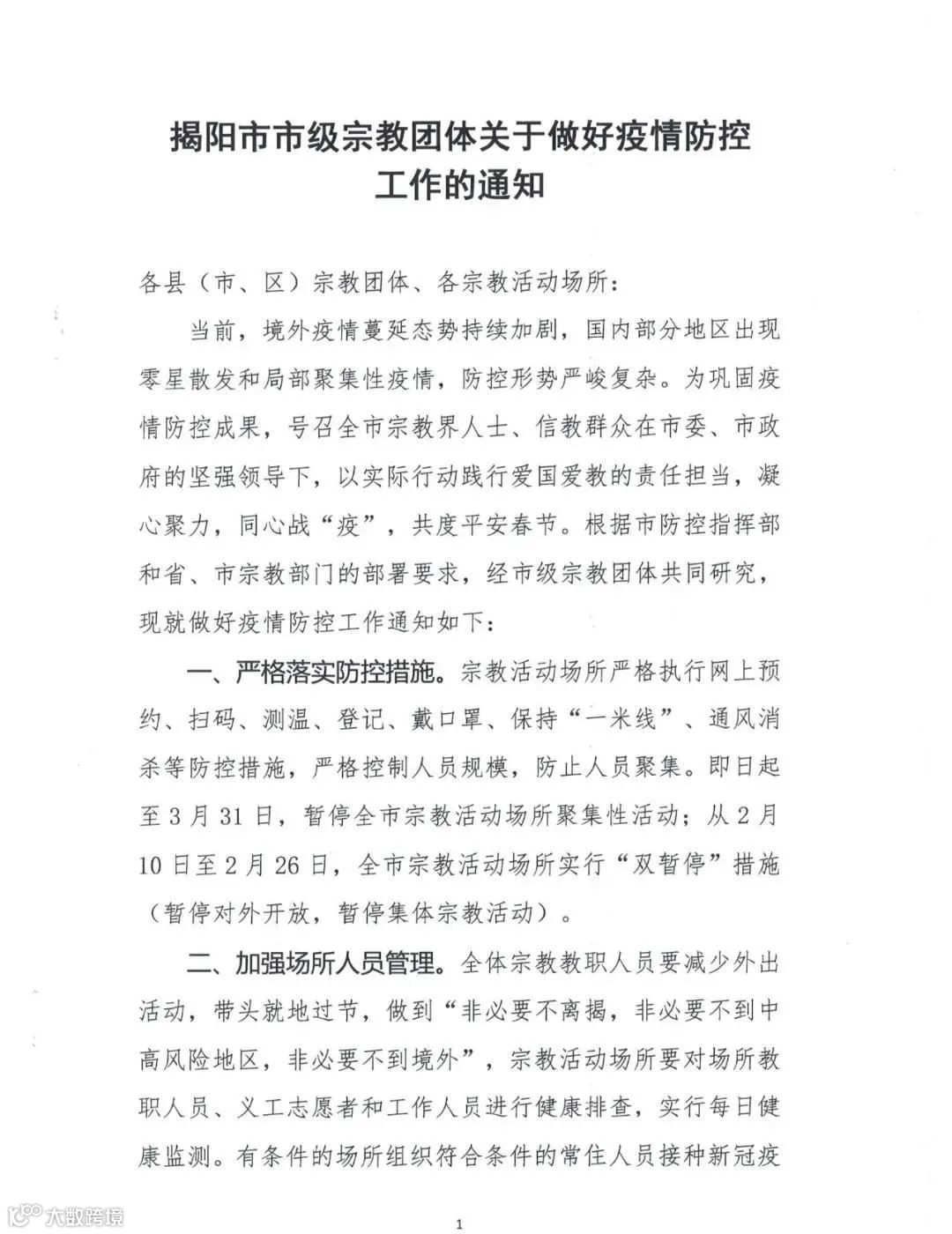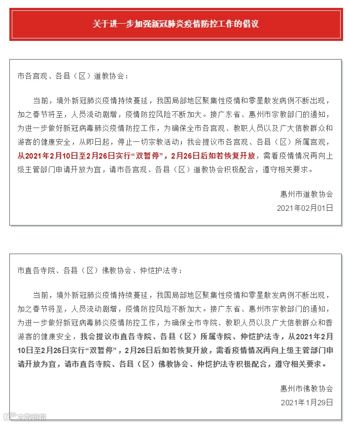 通知强调,按照市防控指挥部和省、市宗教部门的部署要求,经市级宗教团体共同研究决定:即日起至3月31日,暂停全市宗教活动场所聚集性活动;从2月10日至2月26日,全市宗教活动场所实行“双暂停”措施(暂停对外开放,暂停集体宗教活动)。