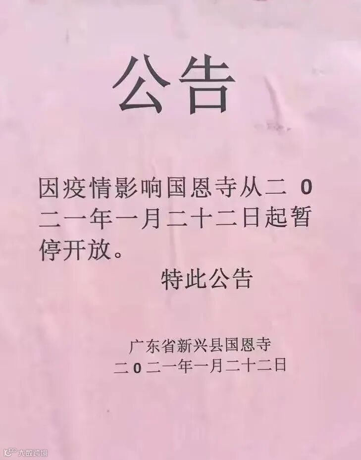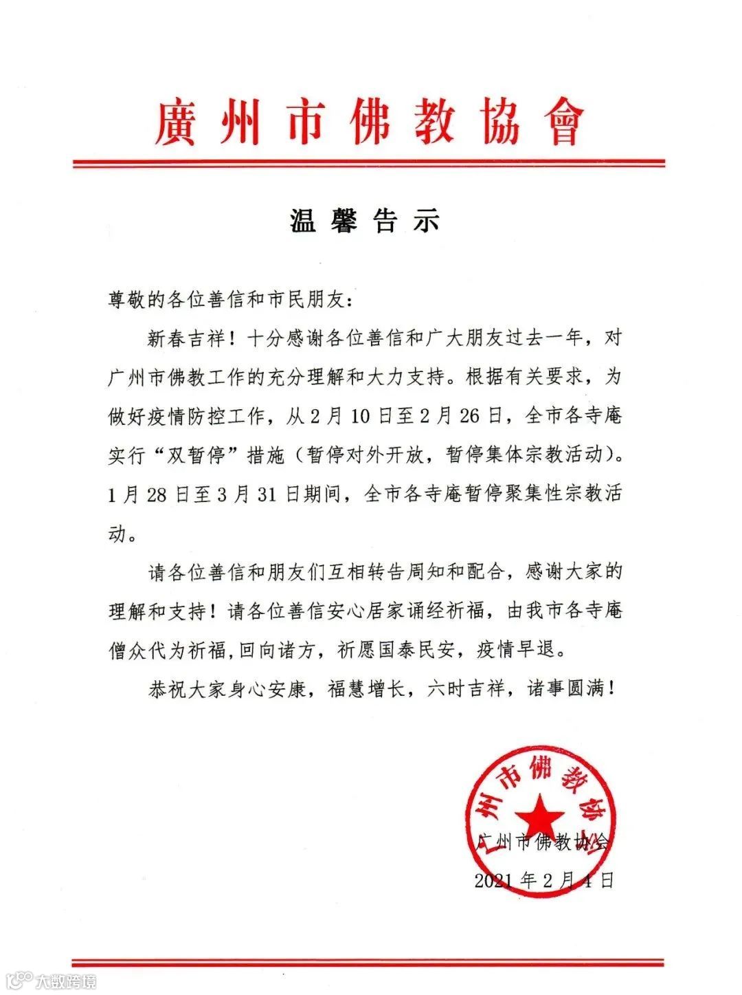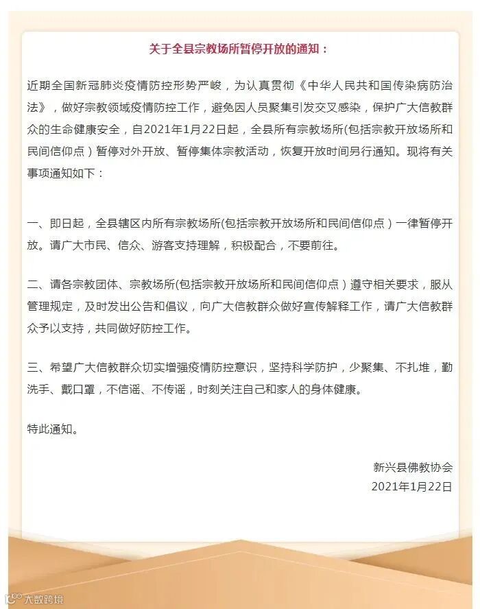 云浮新兴县佛教协会发布通知,自2021年1月22日起,全县所有宗教场所(包括宗教开放场所和民间信仰点)暂停对外开放、暂停集体宗教活动,恢复开放时间另行通知。