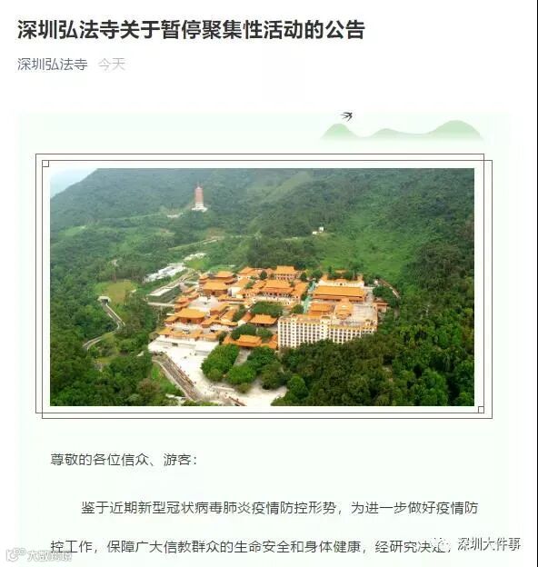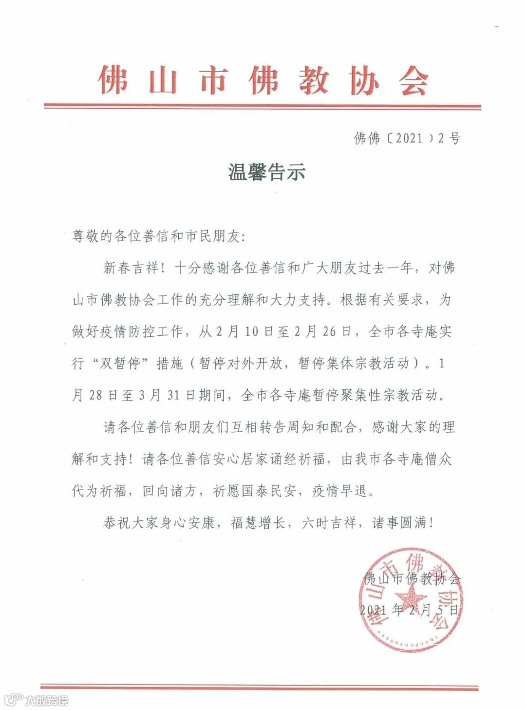 1月28日至3月31日期间,佛山各寺庵暂停聚集性宗教活动。