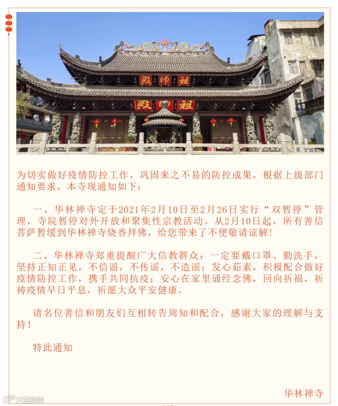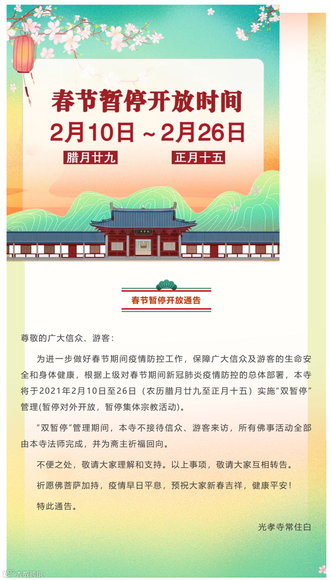 为进一步做好春节期间疫情防控工作,仁寿寺于2021年2月10日至2月26日(农历腊月廿九日至正月十五日)实施“双暂停”管理(暂停对外开放,暂停集体宗教活动)。