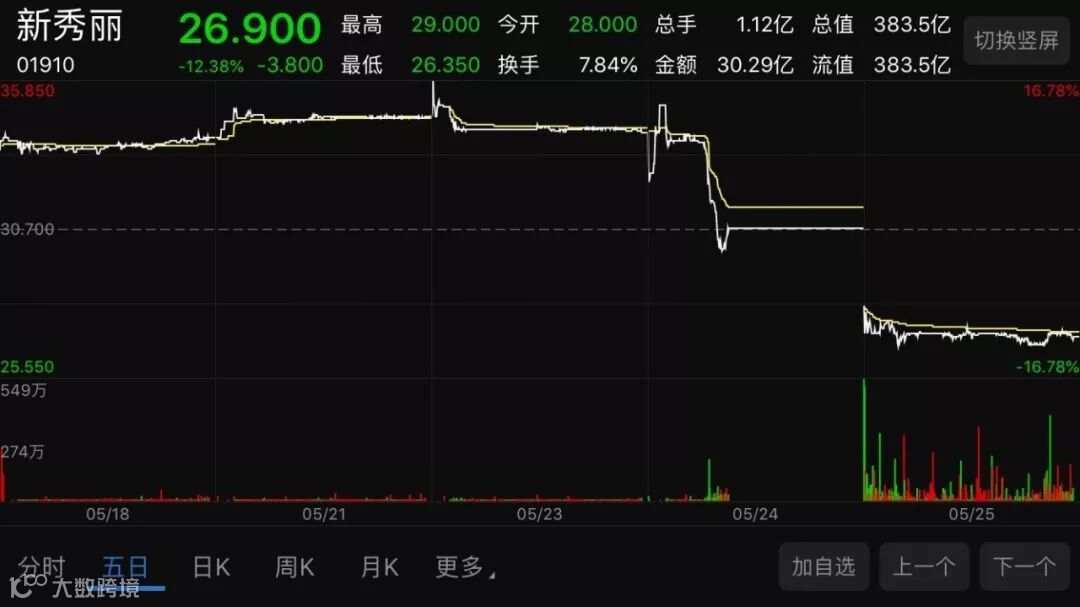 5月24日上午,新秀丽紧急停牌,停牌前股价报30.7港元/股。当晚公司发布澄清并复牌公告。5月25日早间,新秀丽股价低开,截至收盘,报26.9港元/股,两日跌幅约21%,总市值从23日的约475.53亿港元掉至383.48亿港元,蒸发超90亿。