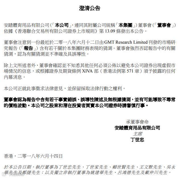 特步国际周五早间公布,公司董事会知悉,GMT于2018年6月12日刊发的报告,其载有与公司财务资料有关的若干指控。