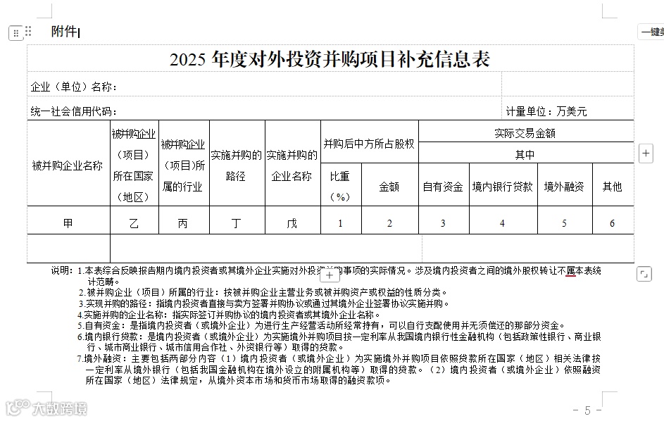 (三)完善对外投资并购情况。请2025年度完成对外投资并购的企业于2026年5月26日前填报《2025年度对外投资并购项目补充信息表》(详见附件)并报送至我厅电子邮箱(hnshzc@163.com)。已在“商务部业务系统统一平台”报送过对外投资并购月报的项目无需再次报送。