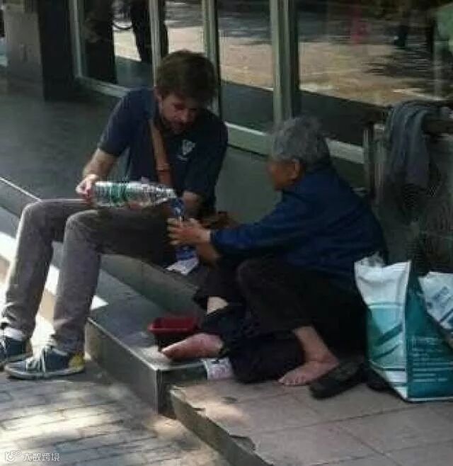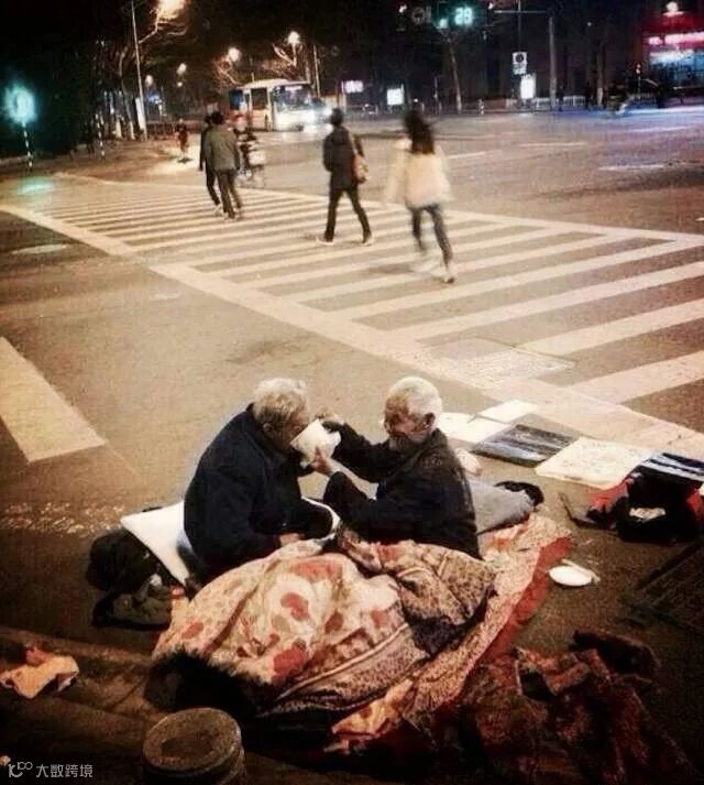 在街边乞讨的老爷爷,买了一碗面,不舍得吃,自己饿着,先让老奶奶吃饱。