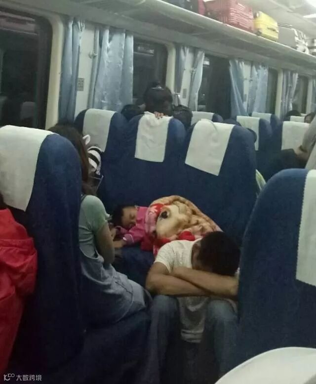 火车上,为了让儿子睡的舒服一些,父亲干脆坐在地上休息。
