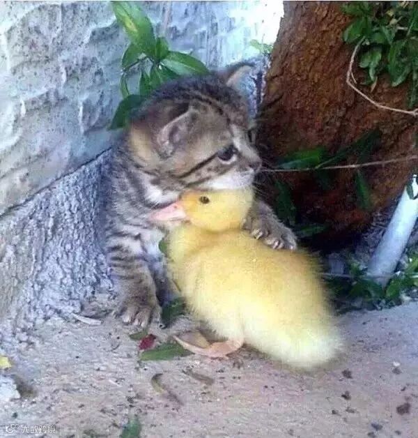 一只小猫,把一只孤零零的小鸭子搂在了怀里……
