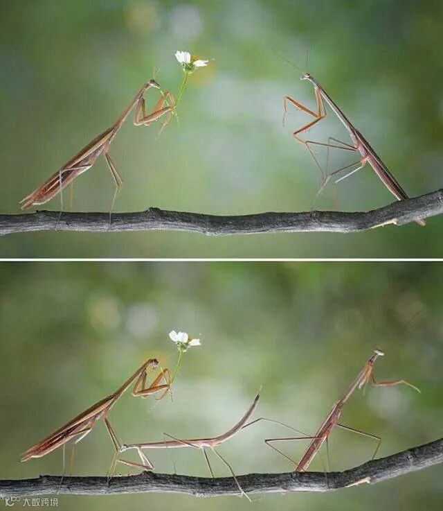 摄影师拍下了这样的一幕,螳螂拿着一朵花向伴侣示爱。