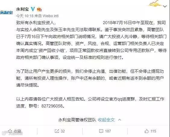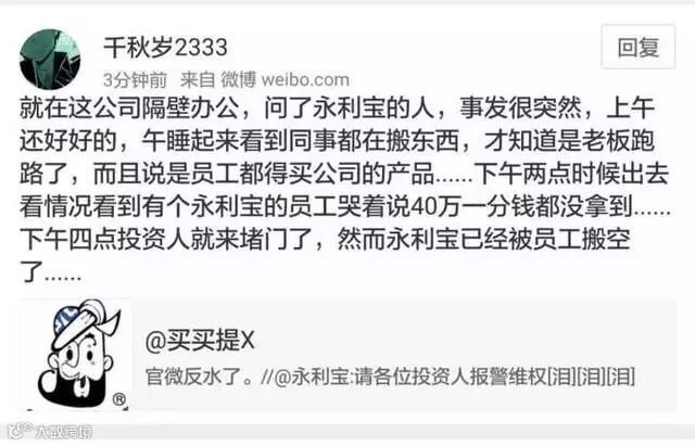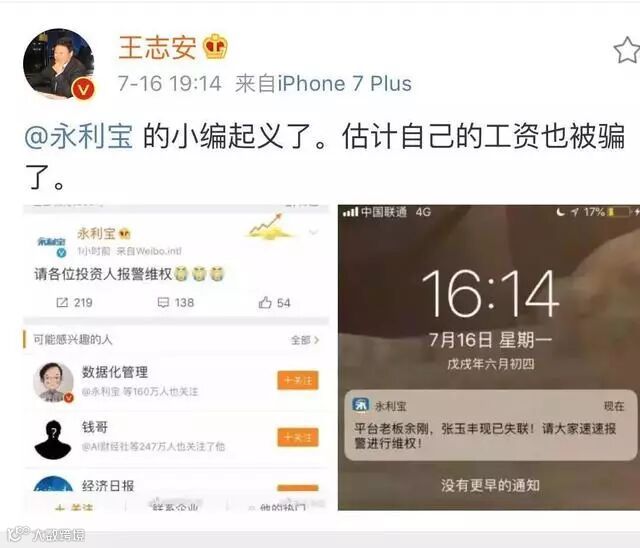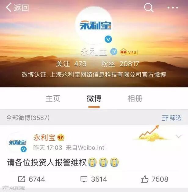 同时,认证账号“永利宝”发微博:请各位投资人报警!