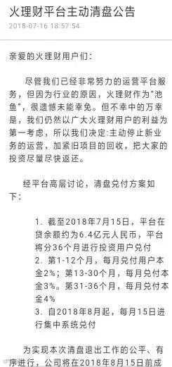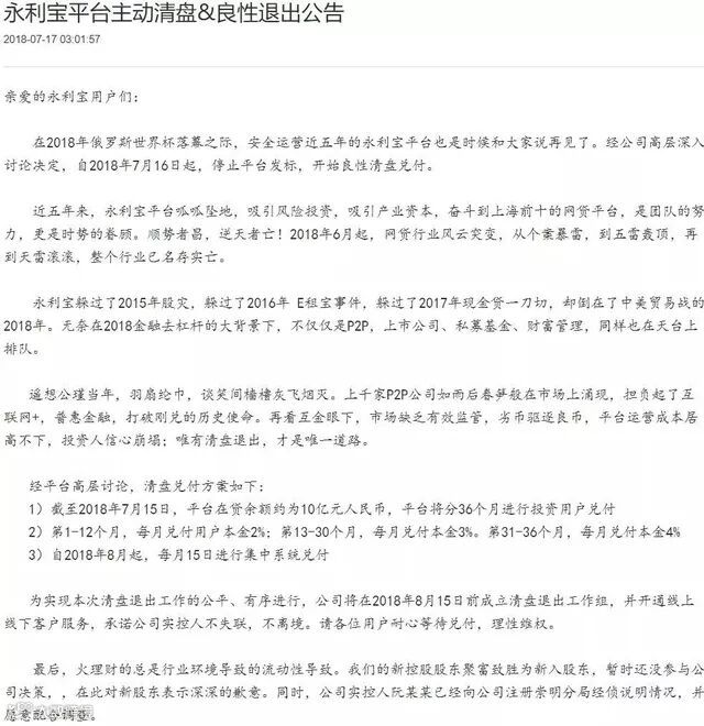 公告中提到,平台将在2018年8月15日前成立清盘退出工作组,并开通线上线下客户服务,承诺公司实控人不失联,不离境。