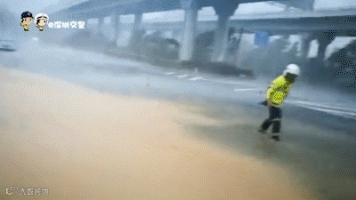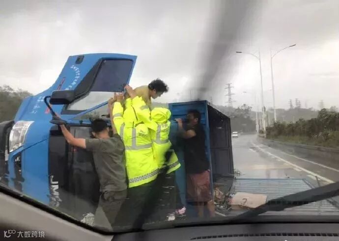 由于翻车现场正处于风口,风力较大,大家手拉手两分钟救出被困人员并送回中队躲避台风。