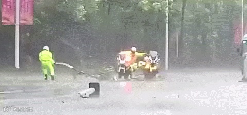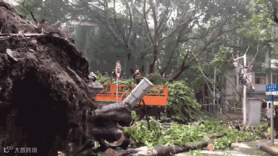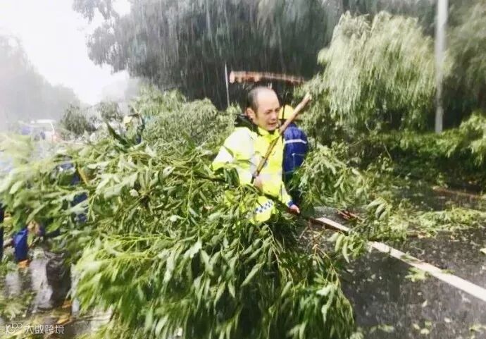 东莞东城交警大队执勤人员顶着狂风暴雨,清理路面障碍,消除交通安全隐患。