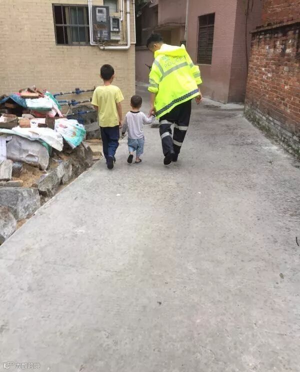戴警官像一位大哥哥一样,牵着两个小朋友的手,一大两小的背影显得格外温馨。