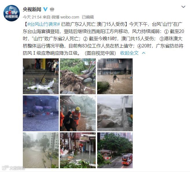 截至昨晚8时,台风“山竹”导致广东省2人死亡。截至昨晚7时,澳门共15人受伤。“山竹”至今已在香港造成超过200人受伤。