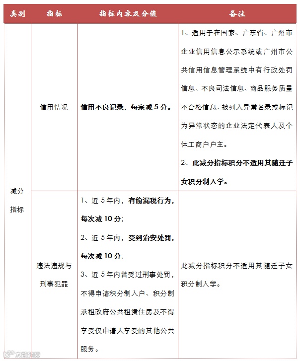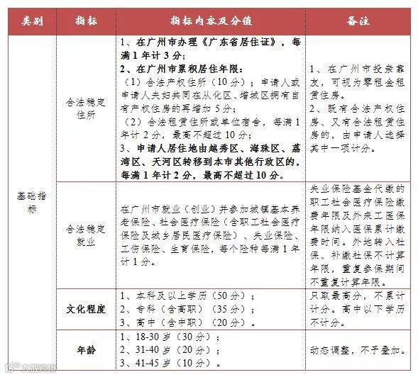 《广州市来穗人员积分制服务管理规定实施细则(试行)》共18条,核心内容是指标体系和分值表。积分指标体系由基础指标、加分指标和减分指标3类12项组成。