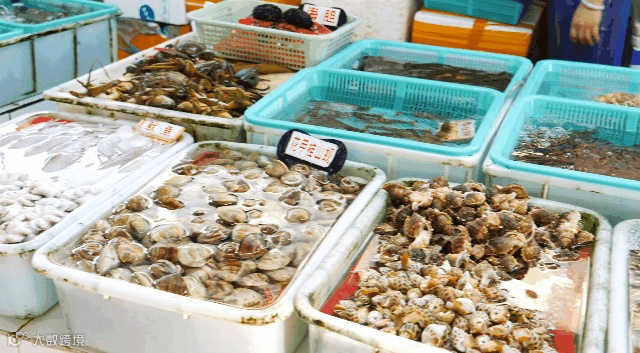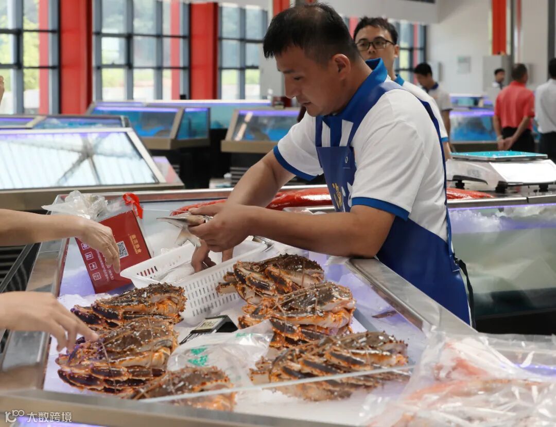 交易厅的旁边是生鲜市场。开渔节当天,生鲜市场餐饮配套开业,目前,已入驻商户主要经营包括帝王蟹、松叶蟹,金枪鱼、黑虎虾、鲍鱼、海参等活鲜及冰鲜产品。