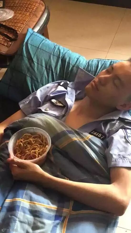 这位民警叫沈程磊,平时主要负责查处治安刑事案件。他已经连续高强度工作四周多了。深夜他处理完一起案件,做完笔录已经是凌晨5点了,一夜没睡的他没顾上吃早饭,紧接着忙起手头上的工作。一直到中午午休时间,同事给他带了碗炒面,但沈程磊才吃了一口,便抵不住疲惫,捧着面就睡着了。