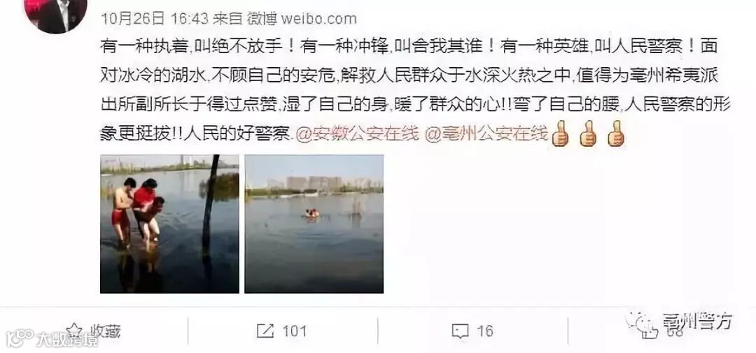 2017年10月26日上午,安徽省亳州市公安局经开分局希夷派出所民警巡逻时,接群众求助:有人跳湖!民警带着队员迅速赶到现场,发现女子正在向湖中央走去,当时湖水已经淹没了女子嘴部,民警立即脱掉警服跳进湖中营救。但女子不愿上岸,称其不想活了,民警只得强行将女子背上岸。
