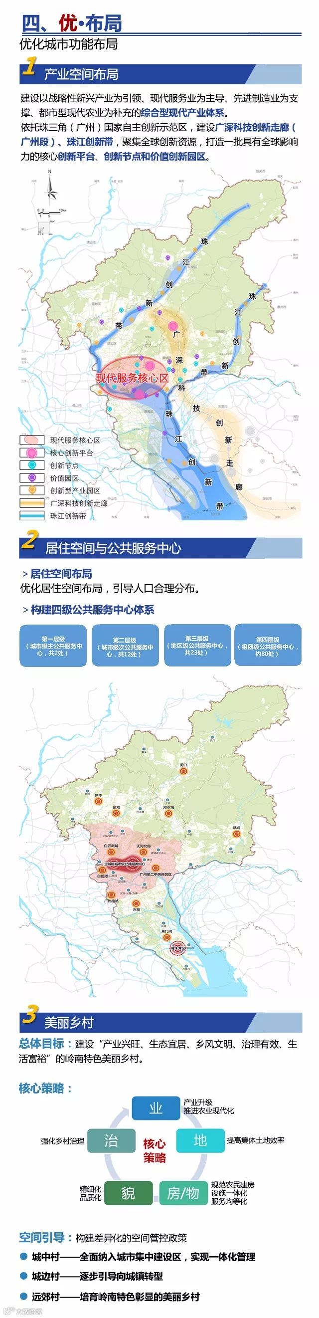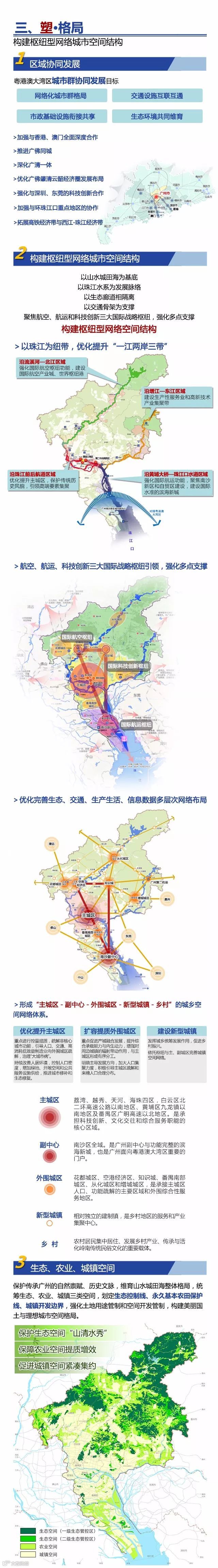 城市结构:以山水城田海为基地、以珠江水系为发展脉络、以生态廊道下相隔离、以交通骨架为支撑、聚焦航空、航运和科技创新三大国际战略枢纽、强化多点支撑、构建枢纽型网络空间结构。