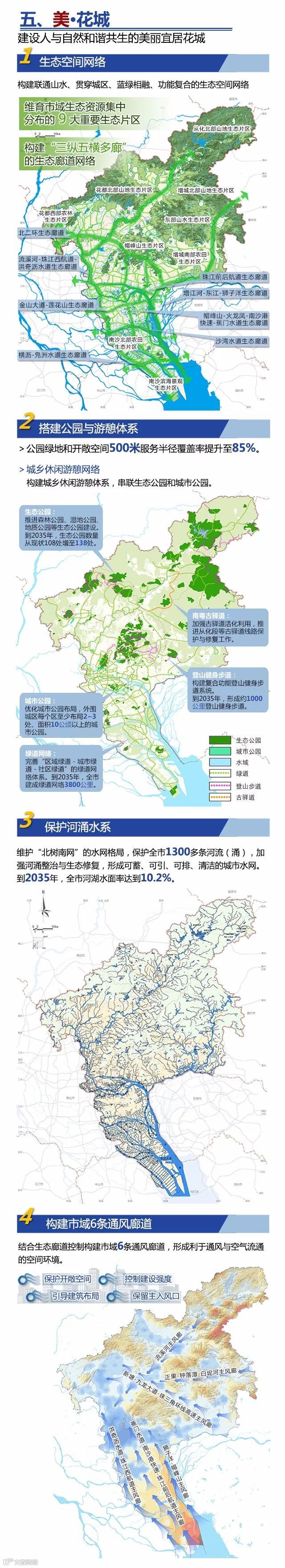 到2035年,生态公园数量从现状108处增至138处;形成约1000公里登山健身步道;优化城市公园布局,外围区域每个区至少布局2~3处,面积10公顷以上的城市公园;全市建成绿道网络3800公里。
