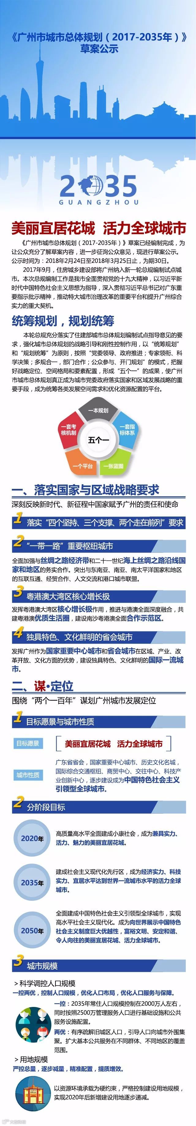 《规划》草案为未来近20年广州发展谋划了清晰脉络。草案提出:2035年人口将控制在2000万;番禺部分区域首次明确被纳入主城区;特别提出要“强南沙”,南沙区将成为广州副中心和海滨新城,逐步建成“引领型全球城市”。
