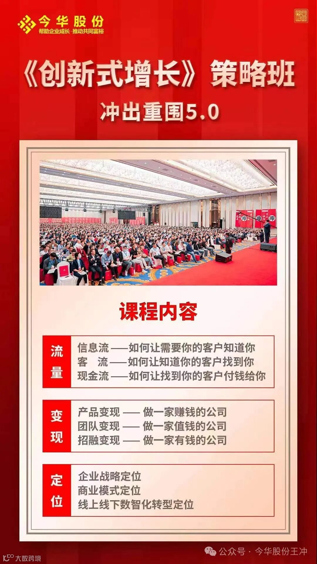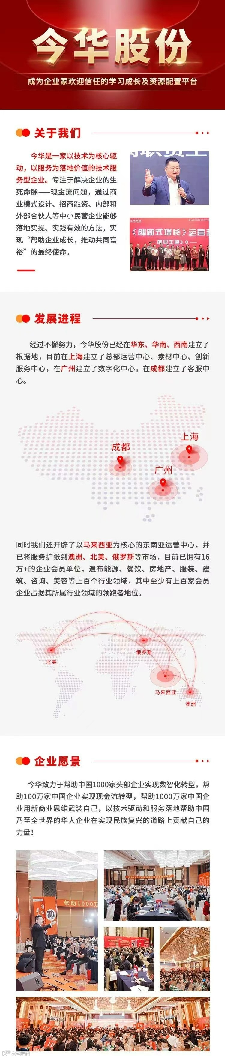 今华是一家以技术为核心驱动,以服务为落地价值的技术服务型企业。专注于解决企业的生死命脉-现金流问题,通过商业模式设计、招商融资、内部和外部合伙人等中小民营企业能够落地实操、实践有效的方法,实现“帮助企业成长,推动共同富裕”的最终使命
