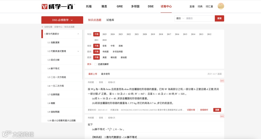 这是我们自主研发的又一力作,汇聚DSE海量题目,并根据知识点及题目难度,进行了标签标记,个性化组题组卷,这种细致分类能让学员能够更加高效、精准地提升。智能系统结合了大数据分析和人工智能技术,能够对学生学习进度进行实时跟踪和全面分析,科学诊断学情,为教师提供精准的教学建议,同时也为学生推荐个性化的学习资源与练习题。