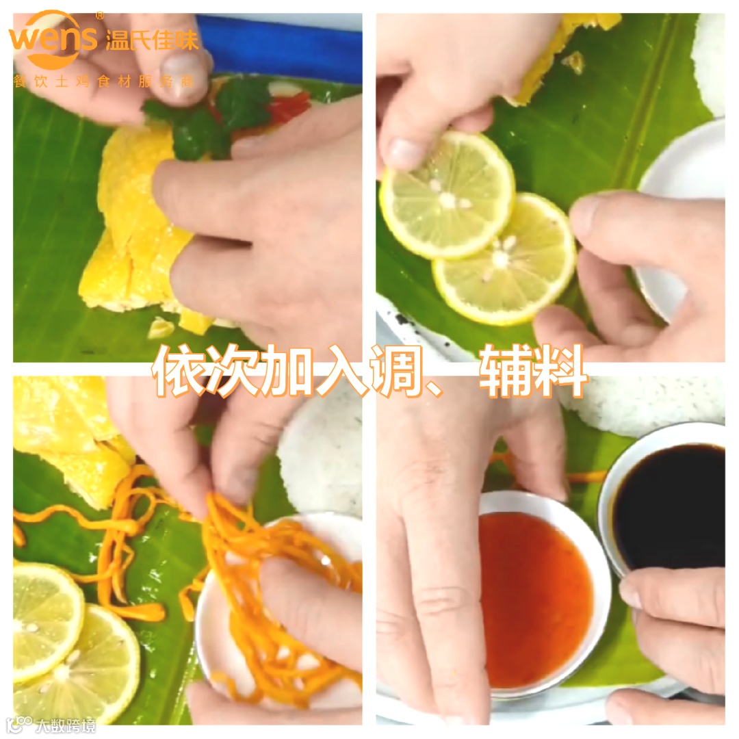 →用芭蕉叶打底,依次放上鸡油饭,柠檬与虫草点缀,最后放上酱油与甜辣酱作蘸料。
