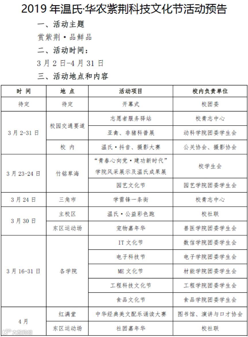 多彩的学生活动让你再次感受一下青春活跃的校园生活。本周末,也就是3月23日、24日两天9:00-17:30,在华山区竹铭草海及红满堂前将分别举办学院风彩及华农&温氏校企合作成果展、亚禽非瘟科普展。到各个摊位溜一溜,你将收获无限口福。