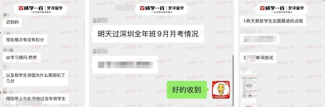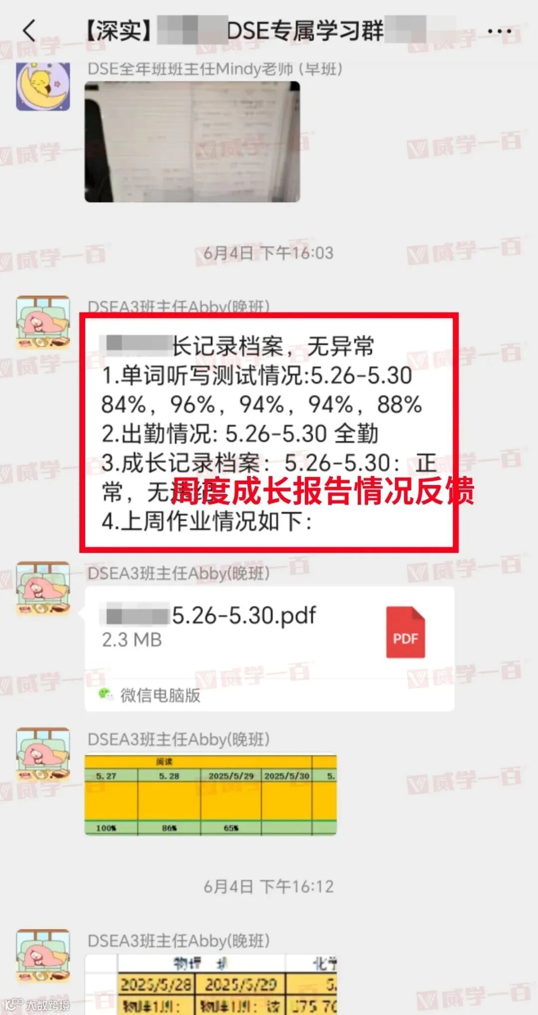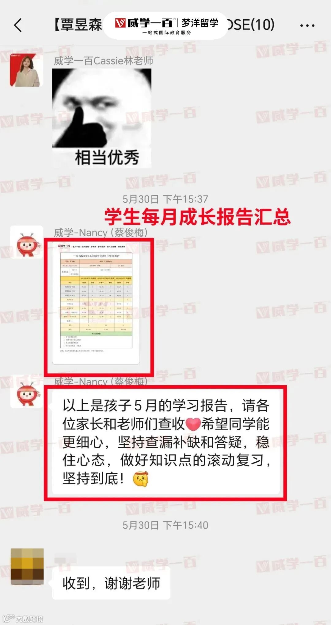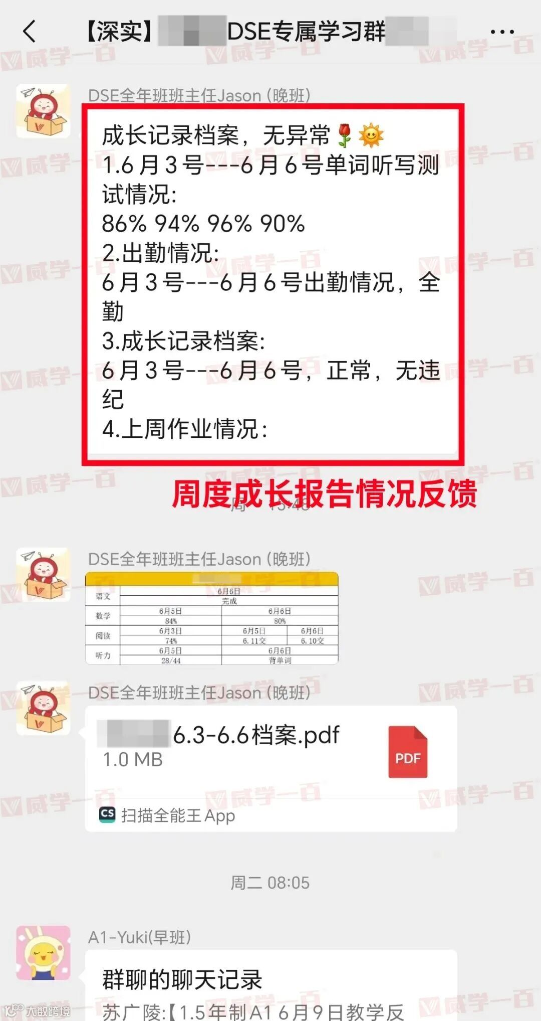 全年班致力于构建一个透明且高效的沟通桥梁,让家长能够深入洞察学员的学习进展和成长历程。班主任每周给家长发送孩子的成长记录 、本周单词测试 、本周出勤 、学习情况等信息,通过这些详尽的记录和分析,家长们能够获得一个全面的视角,深入了解孩子的学习进展和个人成长。