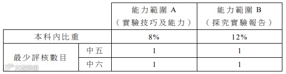 校本评估(SBA)是所有学校考生的必修课。在生物SBA中,要求考生完成规定数量的实际工作,包括科学调查、实验室工作和野外工作等。在中五和中六,将接受两方面的能力评估:实践技能(A)和调查工作报告(B)。能力领域A占学科分数的8%,而能力领域B占12%。