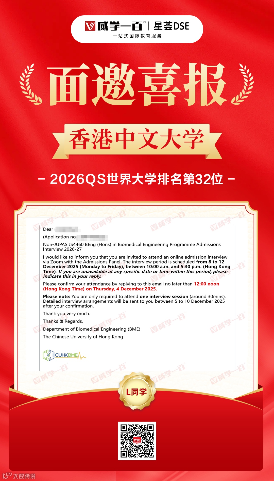 重磅来袭,威学一百DSE学员传来捷报,非港籍的L同学成功拿下2026学年首封香港中文大学面试邀请,在新一轮升学季中抢占先机!这份面邀,不仅是对威学学员学术能力的肯定,更是对威学DSE教学成果的认可。