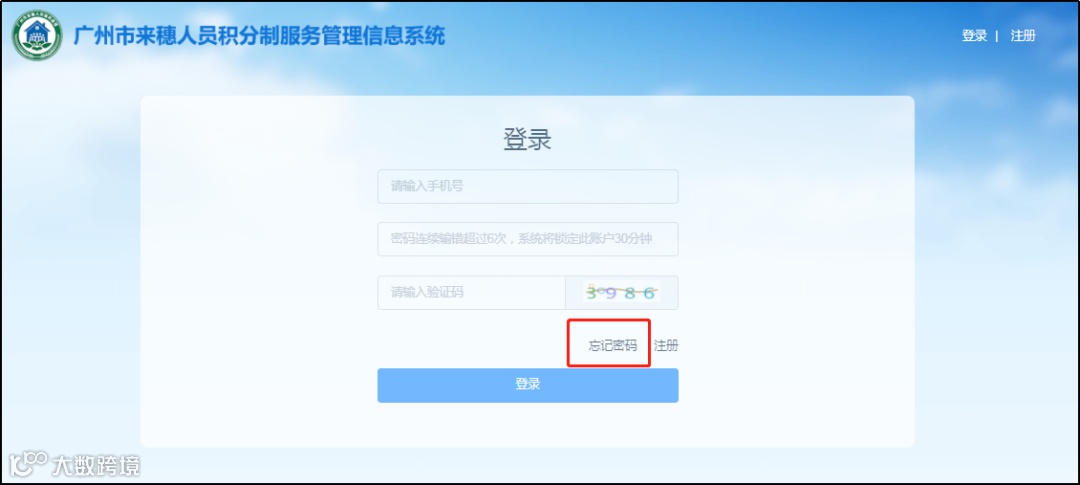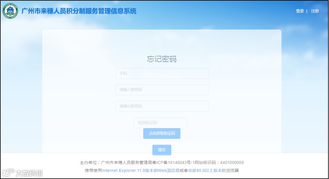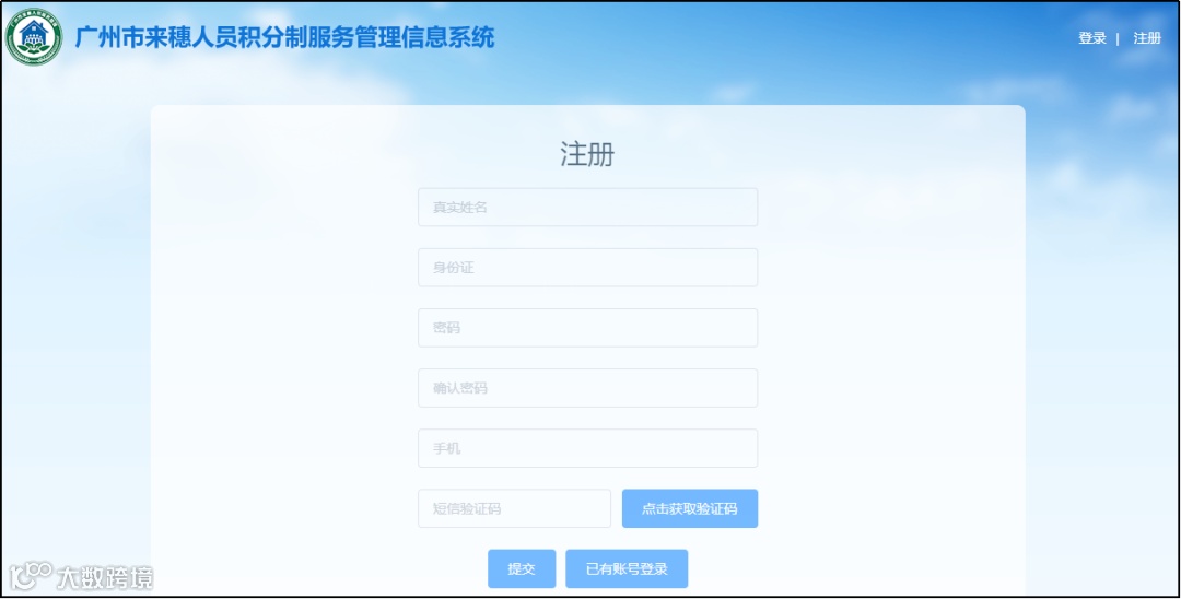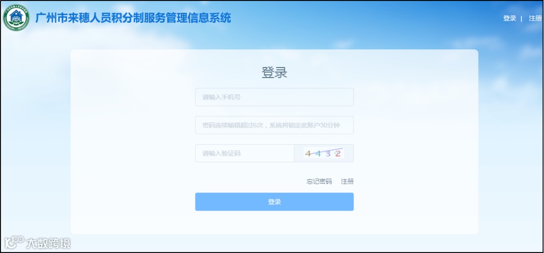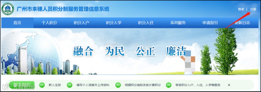 点击“广州市来穗人员积分制服务管理信息系统”进入页面,点击【注册】。如下图所示: