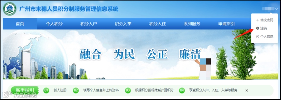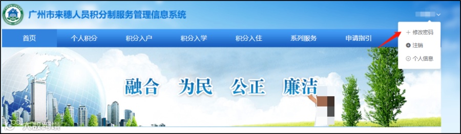 来穗人员登录在积分制服务管理信息系统后,点击用户名,在下拉菜单中选择修改密码,可对登录密码进行修改。