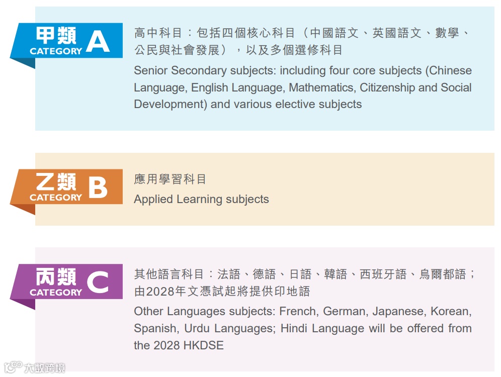 DSE科目分为甲类(高中科目)、乙类(应用学习科目)、丙类(其他语言科目)三大类。