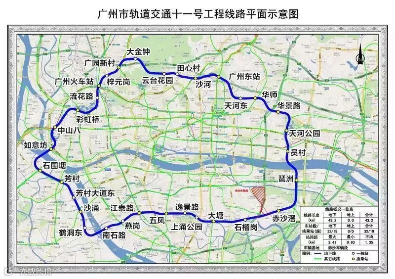 线路全长约44.2公里,全部采用地下敷设方式,全线共设车站32座,另外,代建一座车站(城轨琶洲站),其中换乘站20座,设置赤沙车辆段1座。车辆采用8节A型车编组,最高运行速度80公里/小时。