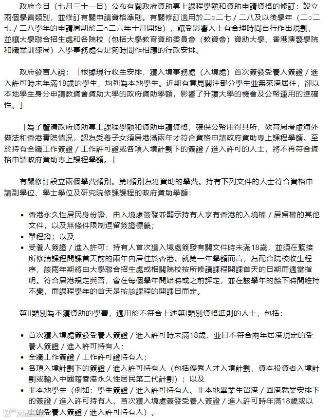 7月31日,香港特区政府公布了针对政府资助专上课程学额及申请资格的重要修订,将从2027/28学年开始,设立两类学费标准,并明确了哪些身份才可获政府资助。