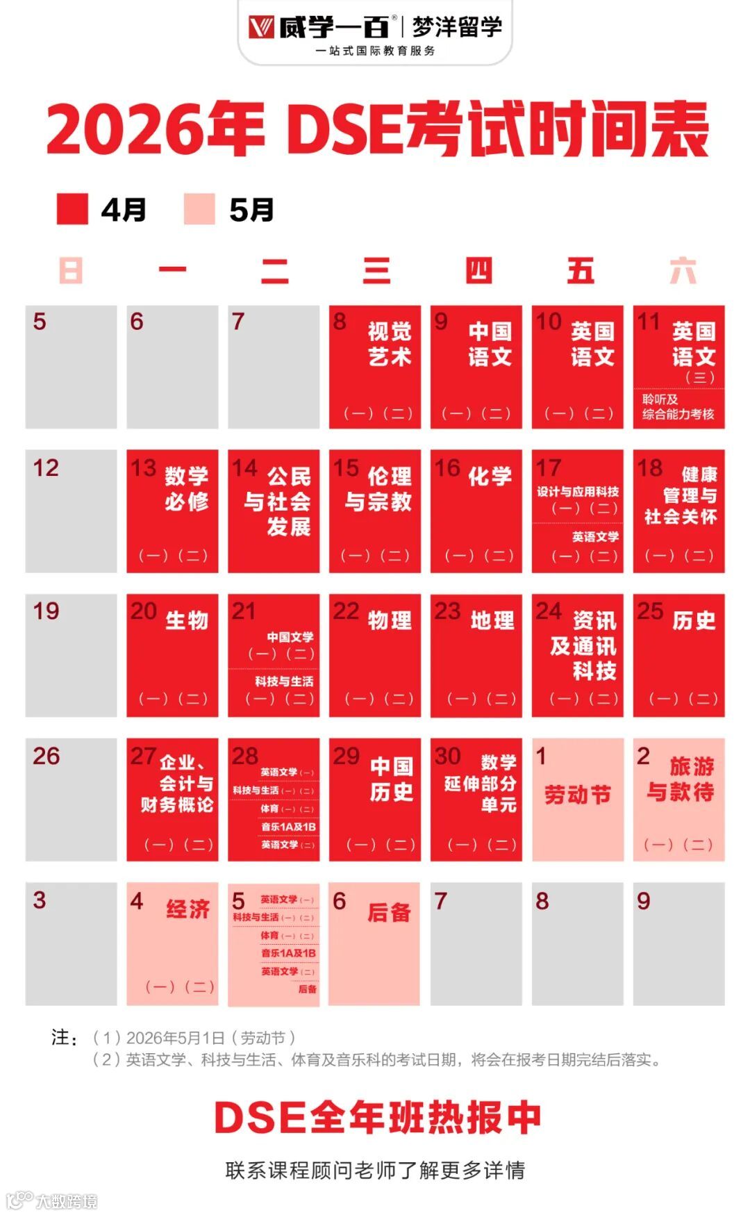 那么,2026年各科目的具体考试时间安排如何?DSE报考&申请时间线又是怎样的?小编已为大家汇总好,参加26年DSE考试的同学,请务必收藏。