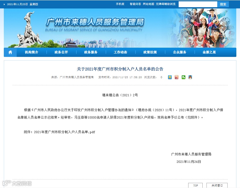 11月25日,2021年度广州市积分制入户确定入户人员名单并向社会公告。快来查查你入围了没有?