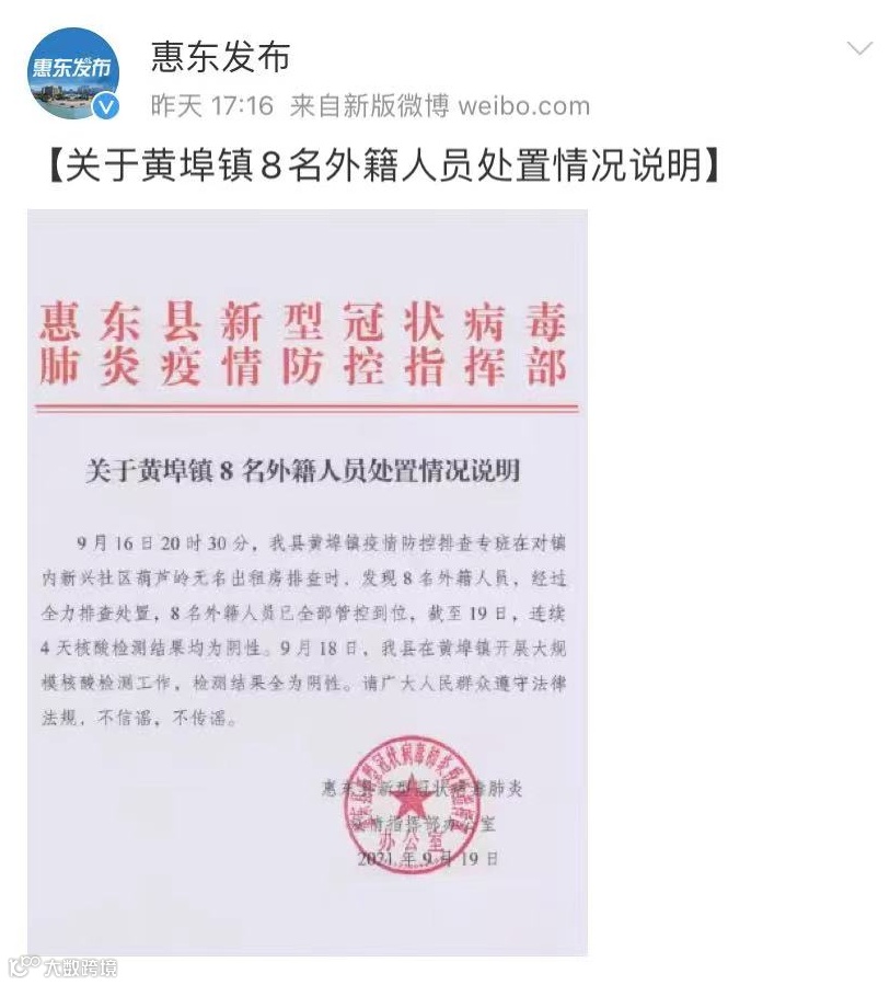 另外,据惠东发布9月19日消息,惠东县新冠病毒肺炎疫情指挥部办公室通报,9月16日20时30分,惠东县黄埠镇疫情防控排查专班在对镇内新兴社区前芦岭无名出租房排查时,发现8名外籍人员,经过全力排查处置,8名外籍人员已全部管控到位,截至19日,连续4天核酸检测结果均为阴性。9月18日,惠东县在黄埠镇开展大规模核酸检测工作,检测结果全为阴性。