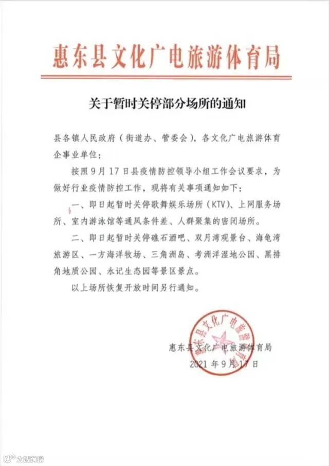 根据通知,惠东县暂时关停的场所包括歌舞娱乐场所(KTV)、上网服务场所、室内游泳馆等密闭场所,以及礁石酒吧、双月湾观景台、海龟湾旅游区、一方海海洋牧场、三角洲岛、考洲洋湿地公园、黑排角地质公园、永记生态园等景区景点。