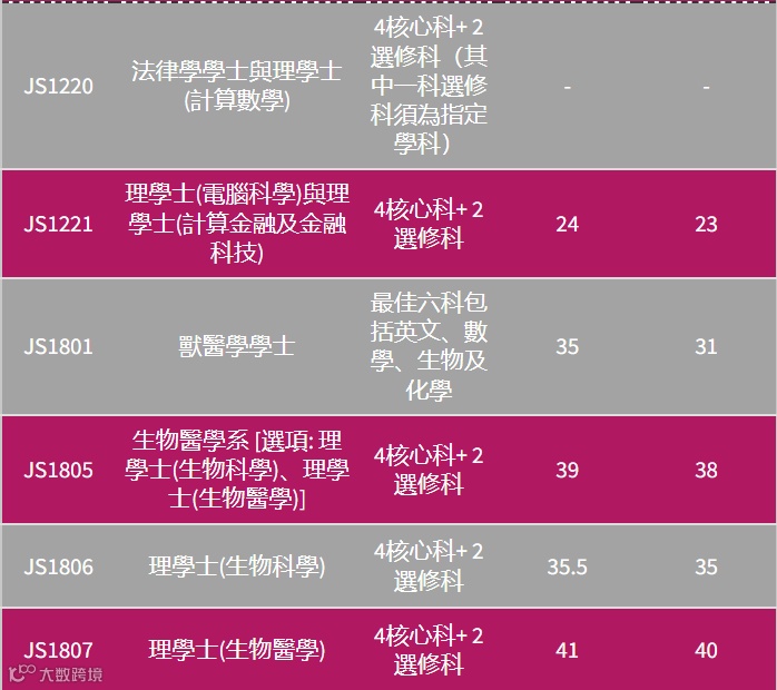 23年城大最高分依旧是医学类专业,其中兽医专业JS1801需要平均每科5.8分(7分满分)。