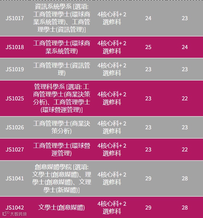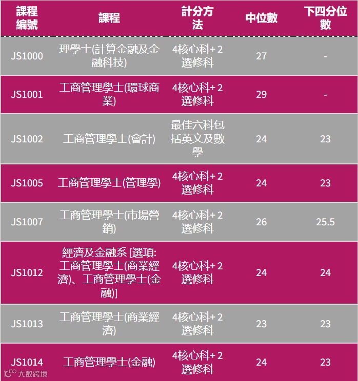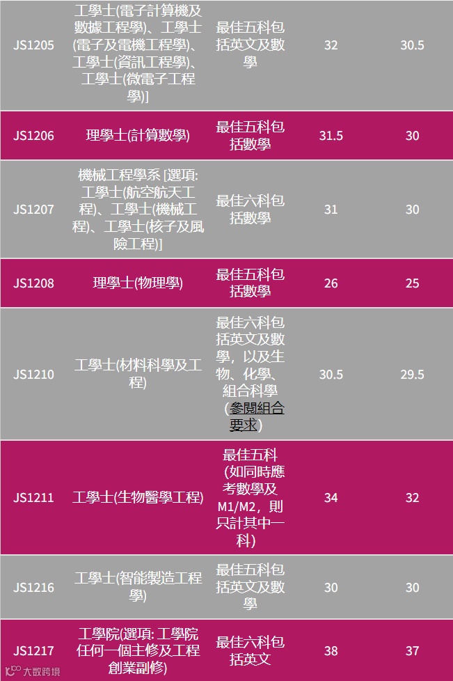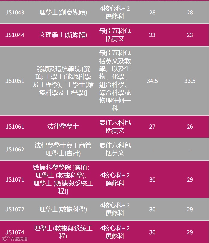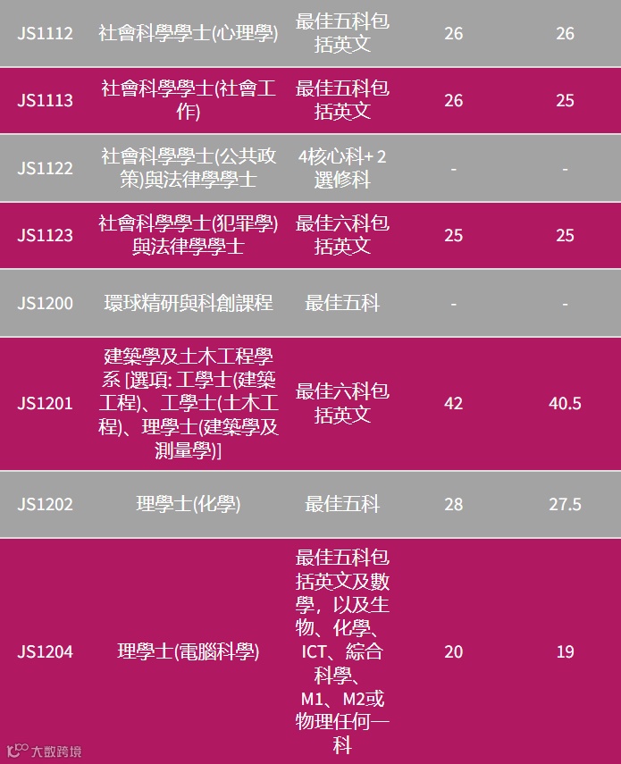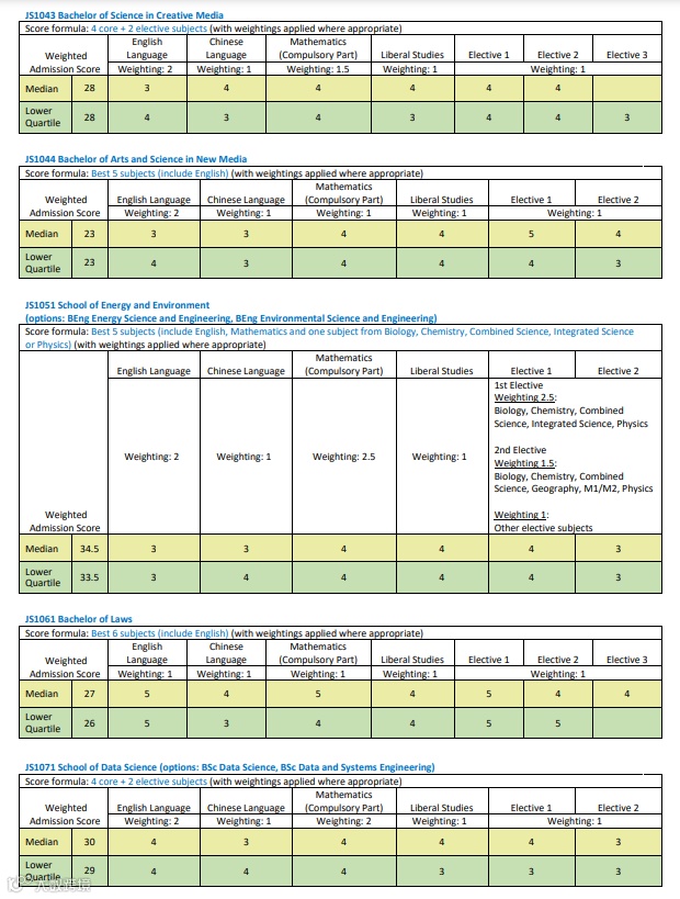 由于近两年香港考DSE的本地生人数逐年递减,因此联招(JUPAS)进城大分数线也持续处于低位,城大不少专业连平均每科考4分都不用,大概3.8至3.3分就能进,特别是理工类专业。