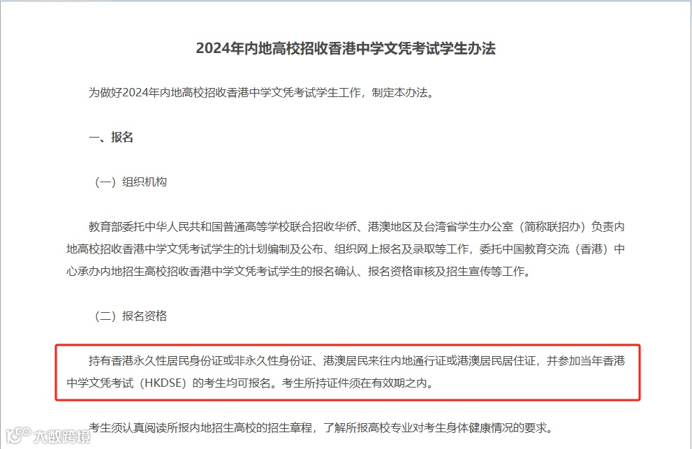 通过DSE报考内地高校必须满足三个条件: 香港永居/非永居+ 回乡证+应届DSE考生,即报考内地学校需要回乡证,永居和非永居身份都无区别。
