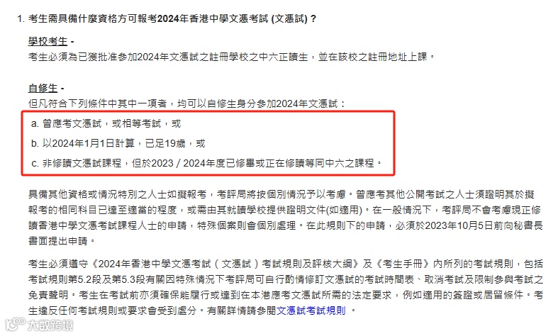 DSE考试并不是必须到一定的年龄才可以参加的。根据考评局发出的公告所示,只要学生符合三个条件的其中一个,就可以报名参加考试。具体的条件如下:
