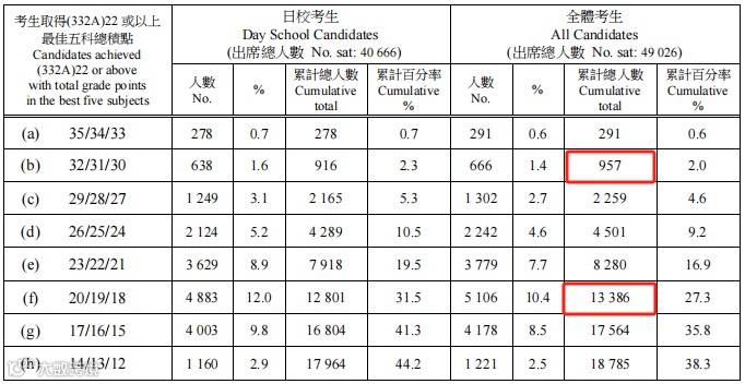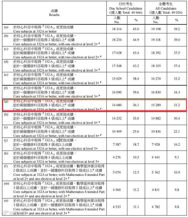 今年,核心科目中取得332A及以上成绩,并于两个选修科目取得3分或以上,即332A+33共计15289人,占比31.2%。这个分数达到了港大、中大、科大、理大、城大、浸大六所院校的基本入学资格。