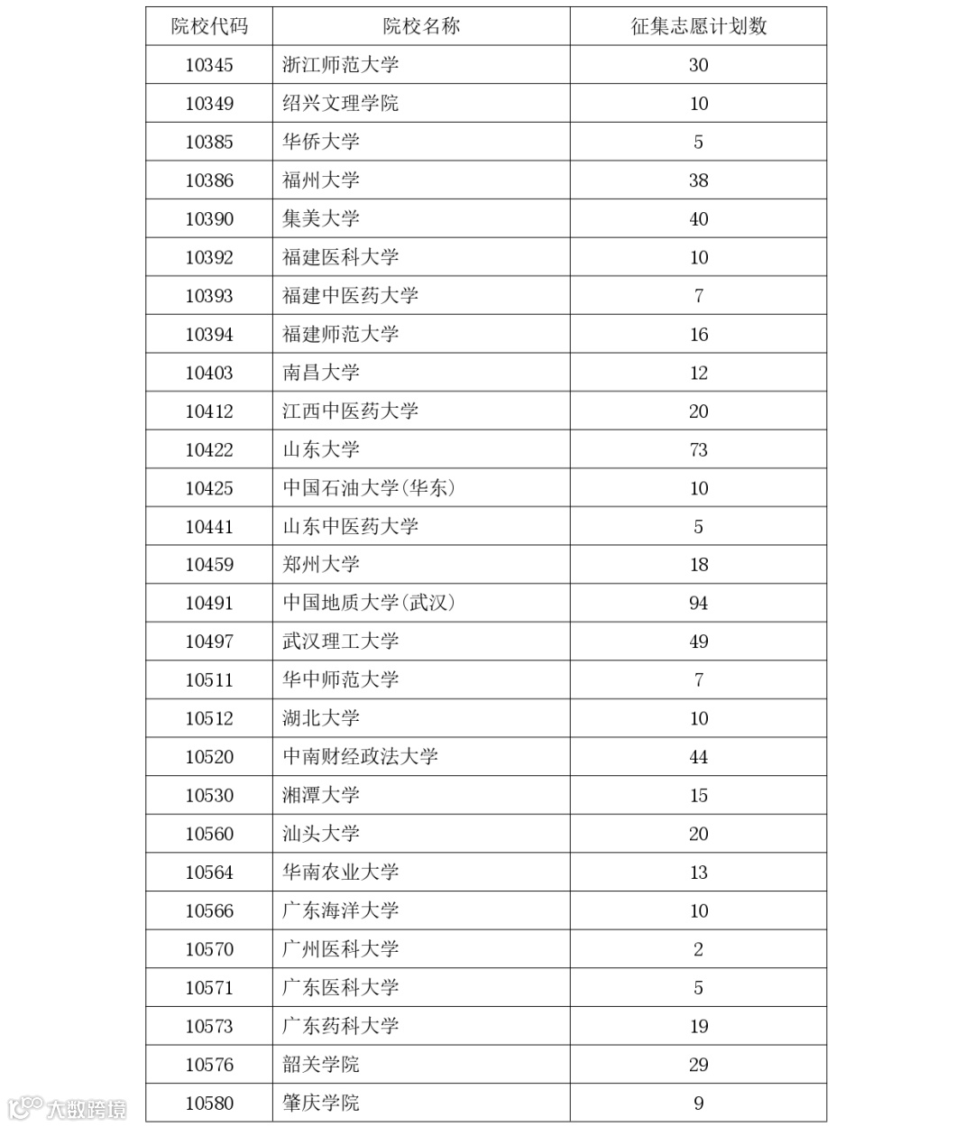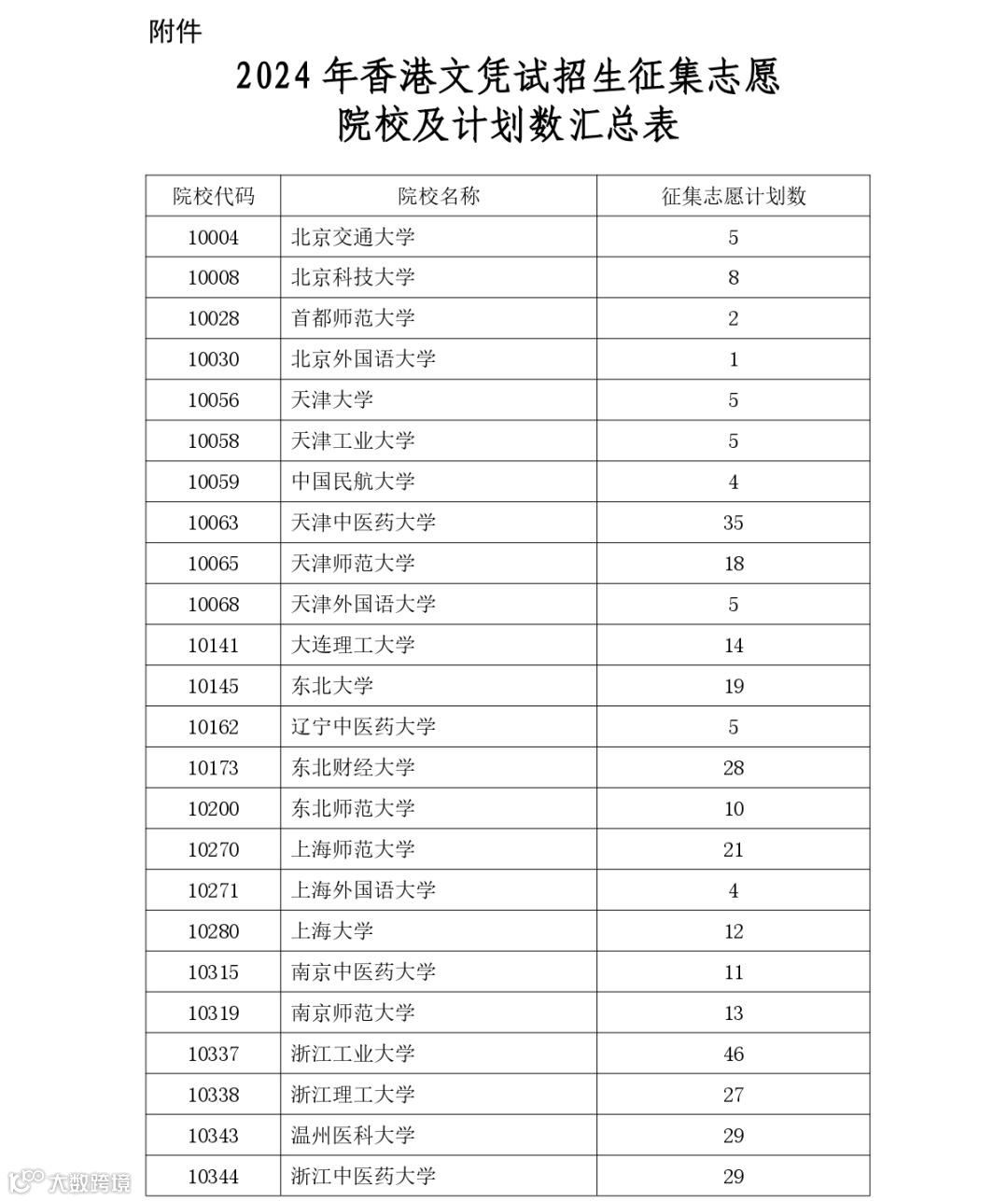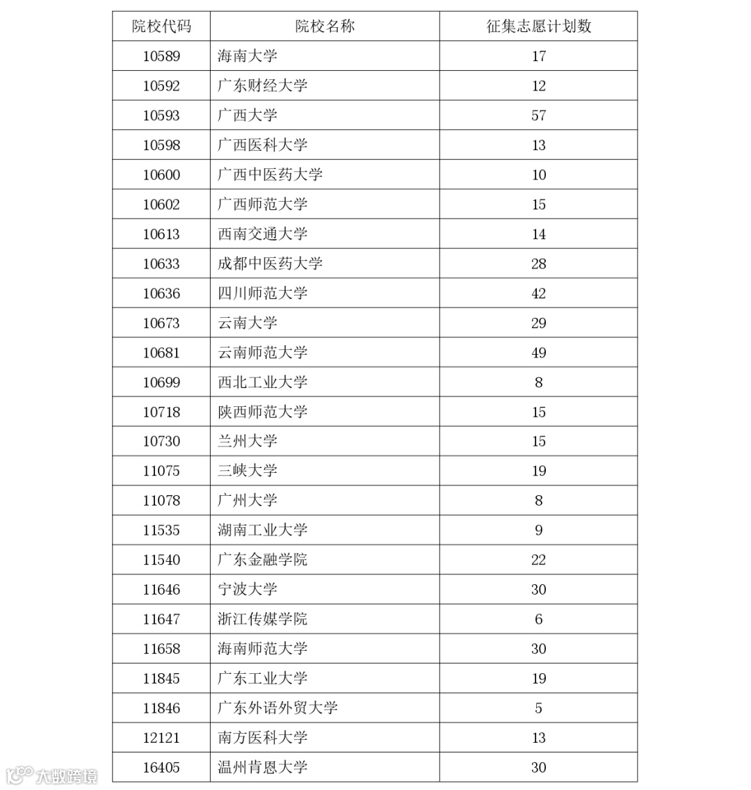 征集志愿院校及计划数汇总表