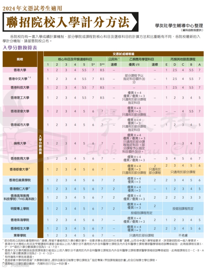大学联招(JUPAS)收生时,各大院校对考生的科目要求、DSE计分方式、科目比重有所不同。