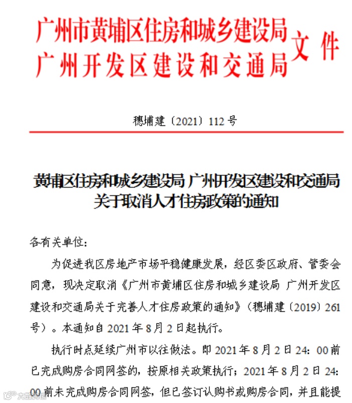 8月2日,黄埔区住房和城乡建设局、广州开发区建设和交通局联合发布了关于取消人才住房政策的通知,购房政策全面收紧!