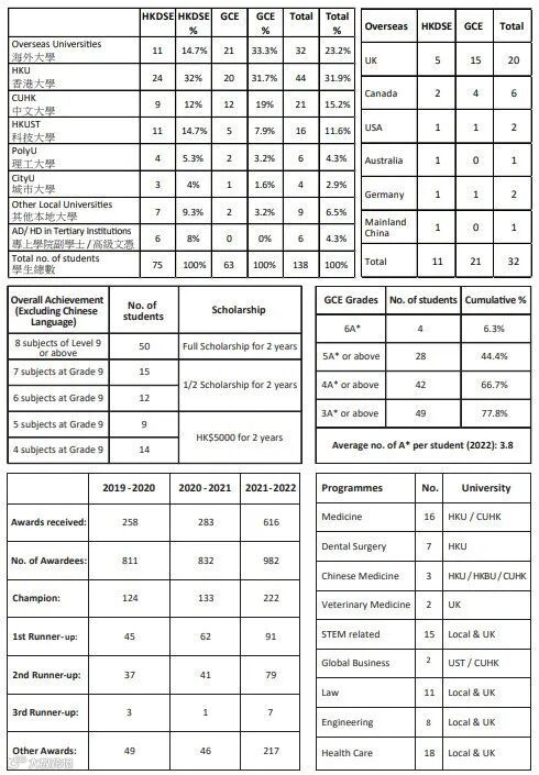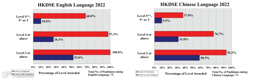2022年共有75名学生参加HKDSE考试,中、英、数三科及总分排名均战绩累累。中文科、英文科,考获5级以上的比例均位于全港前五,英文科第三,中文科第五,总分排名达到全港前十。